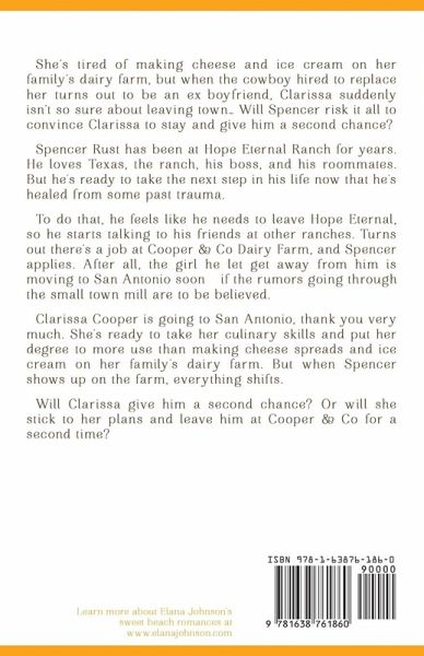 She's tired of making cheese and ice cream on her family's dairy farm, but when the cowboy hired to replace her turns out to be an ex-boyfriend, Clarissa suddenly isn't so sure about leaving town... Will Spencer risk it all to convince Clarissa to stay and give him a second chance? Spencer Rust has been at Hope Eternal Ranch for years. He loves Texas, the ranch, his boss, and his roommates. But he's ready to take the next step in his life now that he's healed from some past trauma. To do that, he feels like he needs to leave Hope Eternal, so he starts talking to his friends at other ranches. Turns out there's a job at Cooper & Co Dairy Farm, and Spencer applies. After all, the girl he let get away from him is moving to San Antonio soon - if the rumors going through the small town mill are to be believed. Clarissa Cooper is going to San Antonio, thank you very much. She's ready to take her culinary skills and put her degree to more use than making cheese spreads and ice cream on her family's dairy farm. But when Spencer shows up on the farm, everything shifts. Will Clarissa give him a second chance? Or will she stick to her plans and leave him at Cooper & Co for a second time?