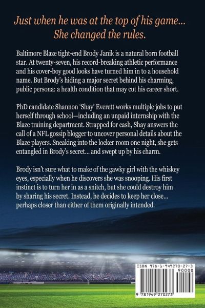Just when he was at the top of his game... She changed the rules. Baltimore Blaze tight-end Brody Janik is a natural born football star. At twenty-seven, his record-breaking athletic performance and his cover-boy good looks have turned him in to a household name. But Brody's hiding a major secret behind his charming, public persona: a health condition that may cut his career short. PhD candidate Shannon 'Shay' Everett works multiple jobs to put herself through school-including an unpaid internship with the Blaze training department. Strapped for cash, Shay answers the call of a NFL gossip blogger to uncover personal details about the Blaze players. Sneaking into the locker room one night, she gets entangled in Brody's secret... and swept up by his charm. Brody isn't sure what to make of the gawky girl with the whiskey eyes, especially when he discovers she was snooping. His first instinct is to turn her in as a snitch, but she could destroy him by sharing his secret. Instead, he decides to keep her close... perhaps closer than either of them originally intended. The Baltimore Blaze Series: Book 1-Game On Book 2-Foolish Games (Crossover to the Chances Inlet Series) Book 3-A Number's Game (Novella and crossover to Milwaukee Growlers) Book 4-Risky Game Book 5-Sleeping with the Enemy