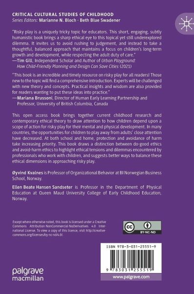 This open access book brings together current childhood research and contemporary ethical theory to draw attention to how children depend upon a scope of action for risky play for their mental and physical development. In many countries, the opportunities for children to play away from adults' close attention have decreased. At both school and home, protection and avoidance of harm take increasing priority. This book draws a distinction between do-good ethics and avoid-harm ethics to highlight ethical tensions and dilemmas encountered by professionals who work with children, and suggests better ways to balance these ethical dimensions in approaching risky play.