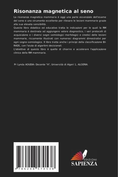 La risonanza magnetica mammaria è oggi una parte essenziale dell'esame del seno e uno strumento eccellente per rilevare le lesioni mammarie grazie alla sua elevata sensibilità.Questo libro didattico ed educativo tratta le indicazioni per le quali la RM mammaria è destinata ad aggiungere valore diagnostico, i vari protocolli di acquisizione e i diversi segni semiologici morfologici e cinetici delle lesioni mammarie, riccamente illustrati con numerosi diagrammi dimostrativi per ogni segno semiologico. Il libro tratta anche i principi della classificazione BI-RADS, con l'aiuto di algoritmi decisionali. L'obiettivo di questo libro è quello di chiarire e accelerare l'applicazione clinica della RM mammaria.