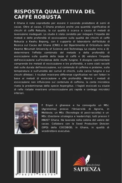 Il Ghana è noto soprattutto per essere il secondo produttore di semi di cacao. Oltre al cacao, il Ghana produce anche una quantità significativa di chicchi di caffè Robusta, la cui qualità è scarsa a causa di metodi di lavorazione inadeguati. Lo studio è stato condotto per indagare l'impatto dei metodi e delle profondità di essiccazione sulla qualità dei chicchi di caffè Robusta a Kwahu Bepong, con il supporto di laboratorio dell'Istituto di Ricerca sul Cacao del Ghana (CRIG) e del Dipartimento di Orticoltura della Kwame Nkrumah University of Science and Technology. Lo studio mira a (I) determinare l'effetto combinato del metodo e della profondità di essiccazione sulla qualità della tazza di caffè e (II) valutare l'impatto dell'essiccazione sull'incidenza delle muffe fungine. Il disegno sperimentale comprende tre metodi di essiccazione e tre profondità, e sono stati raccolti dati sulla durata dell'essiccazione, sul contenuto di caffeina e proteine, sulla temperatura e sull'umidità dei cumuli di chicchi, sulla carica fungina e sui chicchi difettosi. I risultati mostrano differenze significative nei vari fattori in base ai metodi di essiccazione e alle profondità. Mentre i metodi di essiccazione non influiscono sul contenuto di caffeina, la conta microbica rivela la predominanza della specie Aspergillus. I fagioli essiccati su stuoie di rafia rialzate mostrano un'essiccazione più rapida e conteggi microbici inferiori.