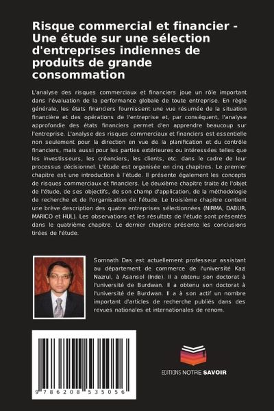 L'analyse des risques commerciaux et financiers joue un rôle important dans l'évaluation de la performance globale de toute entreprise. En règle générale, les états financiers fournissent une vue résumée de la situation financière et des opérations de l'entreprise et, par conséquent, l'analyse approfondie des états financiers permet d'en apprendre beaucoup sur l'entreprise. L'analyse des risques commerciaux et financiers est essentielle non seulement pour la direction en vue de la planification et du contrôle financiers, mais aussi pour les parties extérieures ou intéressées telles que les investisseurs, les créanciers, les clients, etc. dans le cadre de leur processus décisionnel. L'étude est organisée en cinq chapitres. Le premier chapitre est une introduction à l'étude. Il présente également les concepts de risques commerciaux et financiers. Le deuxième chapitre traite de l'objet de l'étude, de ses objectifs, de son champ d'application, de la méthodologie de recherche et de l'organisation de l'étude. Le troisième chapitre contient une brève description des quatre entreprises sélectionnées (NIRMA, DABUR, MARICO et HUL). Les observations et les résultats de l'étude sont présentés dans le quatrième chapitre. Le dernier chapitre présente les conclusions tirées de l'étude.