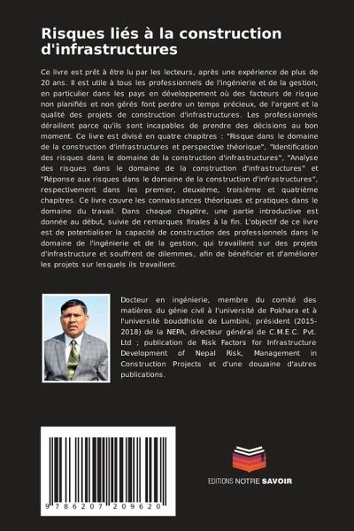 Ce livre est prêt à être lu par les lecteurs, après une expérience de plus de 20 ans. Il est utile à tous les professionnels de l'ingénierie et de la gestion, en particulier dans les pays en développement où des facteurs de risque non planifiés et non gérés font perdre un temps précieux, de l'argent et la qualité des projets de construction d'infrastructures. Les professionnels déraillent parce qu'ils sont incapables de prendre des décisions au bon moment. Ce livre est divisé en quatre chapitres : "Risque dans le domaine de la construction d'infrastructures et perspective théorique", "Identification des risques dans le domaine de la construction d'infrastructures", "Analyse des risques dans le domaine de la construction d'infrastructures" et "Réponse aux risques dans le domaine de la construction d'infrastructures", respectivement dans les premier, deuxième, troisième et quatrième chapitres. Ce livre couvre les connaissances théoriques et pratiques dans le domaine du travail. Dans chaque chapitre, une partie introductive est donnée au début, suivie de remarques finales à la fin. L'objectif de ce livre est de potentialiser la capacité de construction des professionnels dans le domaine de l'ingénierie et de la gestion, qui travaillent sur des projets d'infrastructure et souffrent de dilemmes, afin de bénéficier et d'améliorer les projets sur lesquels ils travaillent.