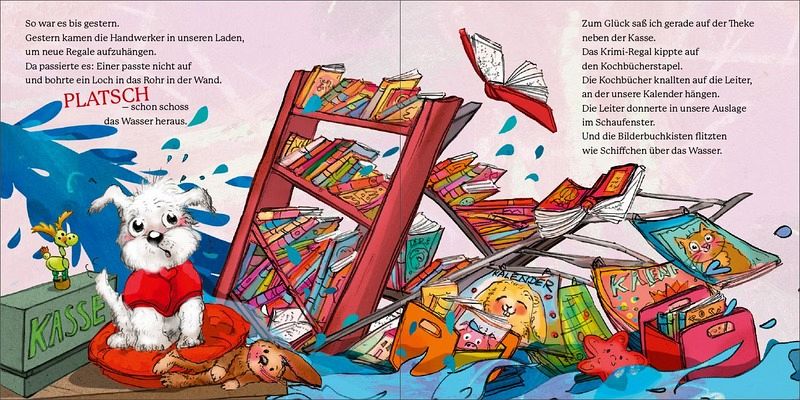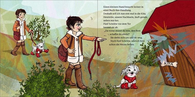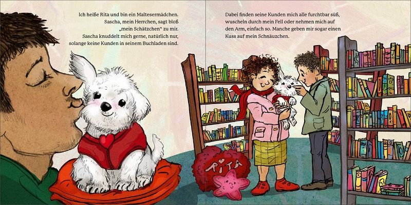 und da stört so ein Hund nur. Also muss Rita in die Kita. Vorsorglich zieht sie ihre roten…mehrRita ist ein wuscheliges kleines Maltesermädchen und sie gehört zu Sascha, der einen Buchladen führt. Alle, die in den Laden kommen, finden sie süß und streicheln sie. Sascha verwöhnt die kleine Hündin und sie ist immer bei ihm, dich dann geschieht ein Unglück. Der ganze Buchladen steht unter Wasser und da stört so ein Hund nur. Also muss Rita in die Kita. Vorsorglich zieht sie ihre roten Anziehsachen schon vorher aus und trifft dann zunächst auf viele große Hunde, erst ganz hinten sind die kleinen Rassen unterwegs. Hier gibt es viel zu spielen und zu toben. Rita fühlt sich wohl in der Kita.