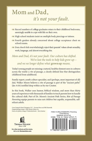 It's no secret: something has happened to America's families. Dramatic shifts in our culture mean that what was once an acceptable way to produce mature, capable adults has now all but disappeared. In Rite of Passage Parenting, family expert Walker Moore explains how that happened. And after concisely assessing the problem, Moore teaches you how to build into your children''s lives the essential experiences every child needs: (1) an authentic Rite of Passage, (2) Significant Tasks, (3) Logical Consequences, and (4) Grace Deposits from parents, grandparents, and other caring adults. Walker Moore writes from years of experience as a minister, family speaker, youth culture specialist, and father. He knows well the damage to self-reliance, self-worth, values foundation, and identity that missing out on these essential experiences can cause. In Rite of Passage Parenting, he shows you how to prevent the damage and help your children move toward adulthood in a healthy way. If you are concerned about the effects of the current cultural chaos; if you notice in your children a lack of responsibility, the lack of a good work ethic, disrespect for authority; if you are worried that your children may experiment with false rites of passage-profanity, smoking, drugs, alcohol, body piercing, or sex-let Walker Moore show you how to provide the four essential experiences most children are missing.