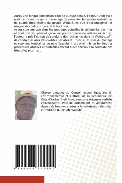 Après une longue immersion dans sa culture natale, l'auteur Djeh Pyco écrit cet opuscule qui a l'avantage de présenter les modes opératoires de quatre rites choisis du peuple Waoulé, en vue d'accompagner les usagers des faits cultuels de la tradition.Ayant constaté que dans les pratiques actuelles le cérémonial des rites et tradition est partout galvaudé pour absence de références écrites, l'auteur a pris l'option de conduire des recherches dans le Walèbo, afin de codifier les rites des civilités, les rites du Tô'nvlè, les rites du mariage et ceux des funérailles en pays Waoulé. Il est ainsi mis en lumière les procédures rituelles et cultuelles devant aider chacun à la conduite des rites cités plus haut.