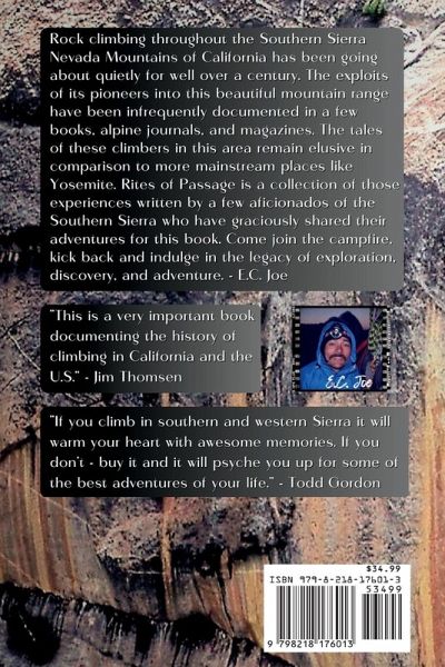 Rites of Passage: The Legacy of Adventure Climbing in the Sierra Nevada Rock climbing throughout the Southern Sierra Nevada Mountains of California has been going about quietly for well over a century. The exploits of its pioneers into this beautiful mountain range have been infrequently documented in a few books, alpine journals, and magazines. The experiences of climbers in this area remain elusive in comparison to more mainstream places like Yosemite. Rites of Passage is a collection of experiences from a few aficionados of the Southern Sierra who have graciously shared their adventures for this book. Come join the campfire, kick back and indulge in the legacy of exploration, discovery, and adventure. - E.C. Joe