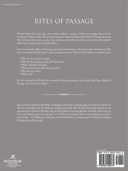Twenty-five (25) years ago, one woman asked a couple of elders to prepare her son for manhood. Today, nearly a thousand young men have completed this Rites of Passage program that addresses the issues so many boys encounter. Families, churches and communities benefit when men mentor the next generation. Every boy needs a Rites of Passage, especially those living in the inner cities of America. This how-to manual details how to start a program in your church. Everything you need is here! Who do you need to begin? What is the program goal and objectives? When should you begin? Where should you base the program? How do you start? Why now? In this manual, you'll find the answers to these questions, and more. Starting a Rites of Passage has never been easier!