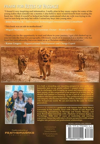 2025 Christlit Book of the Year Award Winner! Oftentimes parents are not raising boys to be men; our sons are simply getting older, but age does not equate to leadership maturity. Parents who desire to raise sons to be men of standard need to be equipped with practical ways to teach young men how to maturate into thriving adults. We should consider thought-provoking questions about our son's development: 1. How does a boy know when he enters manhood? 2. Who affirms and supports this transition from child to adult? 3. How can he know the way unless someone teaches and guides him? 4. What guidance and support is consistently available to help him at home and in his community? If a child's identity is defined by popular culture and trends, they may never find it. Most people, young men in particular, struggle to identify a defining moment in their transition into adulthood. This is a sobering realization and conviction. More than ever, young men have a barrage of distractions telling them who they are. They are challenged with knowing their roles and how to become men of character. The Rites of Passage is not a secret ingredient, and it will not make young boys turn into men. It serves as a demarcation line for parents who want to impart a blessing, encourage belonging, and demonstrate leadership responsibility in their families and communities. We all have influence. You may be a teacher, coach, pastor, supervisor, parent, civil leader, or authority figure. Therefore, you have influence and a responsibility to future generations. The core message of this book speaks to character, legacy, and those who are willing to say: "I will help raise our young men to be leaders of leaders in a world that is desperate for good leadership."