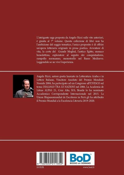 L'intrigante saga proposta da Angelo Rizzi sulle vite anteriori, è giunta al 7° volume. Questa collezione di libri non ha l'ambizione del saggio tematico, l'unico proposito è di offrire un'opera letteraria originale in prosa poetica. Avventure di vita, la corte del Grande Moghul, l'antico Egitto, monaco benedettino, esploratore al seguito dei conquistadores, rampollo normanno, menestrello nel Basso Medioevo. Leggendolo se ne vive l'esperienza.