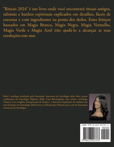 "Rituais 2024" é um livro onde você encontrará rituais antigos, talismãs e banhos espirituais explicados em detalhes, fáceis de executar e com ingredientes na ponta dos dedos. Estes feitiços baseados em Magia Branca, Magia Negra, Magia Vermelha, Magia Verde e Magia Azul irão ajudá-lo a alcançar as suas resoluções este ano.