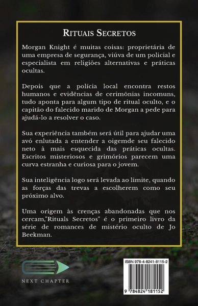 Morgan Knight é muitas coisas: proprietária de uma empresa de segurança, viúva de um policial e especialista em religiões alternativas e práticas ocultas. Depois que a polícia local encontra restos humanos e evidências de cerimônias incomuns, tudo aponta para algum tipo de ritual oculto, e o capitão do falecido marido de Morgan a pede para ajudá-lo a resolver o caso. Sua experiência também será útil para ajudar uma avó enlutada a entender a oigemde seu falecido neto à mais esquecida das práticas ocultas. Escritos misteriosos e grimórios parecem uma curva estranha e curiosa para o jovem. Sua inteligência logo será levada ao limite, quando as forças das trevas a escolherem como seu próximo alvo. Uma origem às crenças abandonadas que nos cercam,"Rituals Secretos" é o primeiro livro da série de romances de mistério oculto de Jo Beekman.