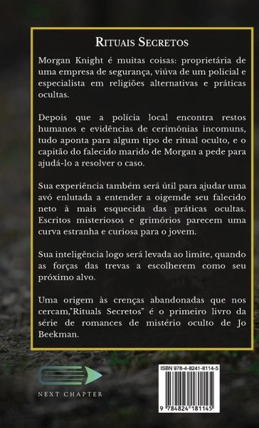 Morgan Knight é muitas coisas: proprietária de uma empresa de segurança, viúva de um policial e especialista em religiões alternativas e práticas ocultas. Depois que a polícia local encontra restos humanos e evidências de cerimônias incomuns, tudo aponta para algum tipo de ritual oculto, e o capitão do falecido marido de Morgan a pede para ajudá-lo a resolver o caso. Sua experiência também será útil para ajudar uma avó enlutada a entender a oigemde seu falecido neto à mais esquecida das práticas ocultas. Escritos misteriosos e grimórios parecem uma curva estranha e curiosa para o jovem. Sua inteligência logo será levada ao limite, quando as forças das trevas a escolherem como seu próximo alvo. Uma origem às crenças abandonadas que nos cercam,"Rituals Secretos" é o primeiro livro da série de romances de mistério oculto de Jo Beekman.