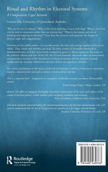 Elections are key public events and in a secular society they are the only real coming together of the social whole. The rituals and rhythms run deep yet the conduct of elections is invariably examined in instrumental ways, as if they were merely competitive games or liberal apparatus. Focusing on the political cultures and laws of the UK, the US and Australia, this book offers an account of the intersection of electoral systems and the concepts of ritual, rhythm and the everyday, which form the basis of how we experience elections.