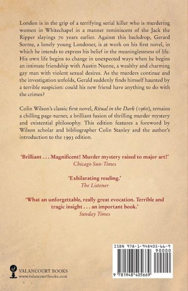 London is in the grip of a terrifying serial killer who is murdering women in Whitechapel in a manner reminiscent of the Jack the Ripper slayings 70 years earlier. Against this backdrop, Gerard Sorme, a lonely young Londoner, is at work on his first novel, in which he intends to express his belief in the meaninglessness of life. His own life begins to change in unexpected ways when he begins an intimate friendship with Austin Nunne, a wealthy and charming gay man with violent sexual desires. As the murders continue and the investigation unfolds, Gerald suddenly finds himself haunted by a terrible suspicion: could his new friend have anything to do with the crimes? Colin Wilson's classic first novel, Ritual in the Dark (1960), remains a chilling page-turner, a brilliant fusion of thrilling murder mystery and existential philosophy. This edition features a foreword by Wilson scholar and bibliographer Colin Stanley and the author's introduction to the 1993 edition. 'Brilliant . . . Magnificent! Murder mystery raised to major art!' - Chicago Sun-Times 'Exhilarating reading' - The Listener 'What an unforgettable, really great evocation. Terrible and tragic insight ... an important book' - Sunday Times