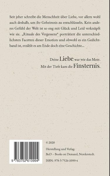 Seit jeher schreibt die Menschheit über Liebe, vor allem wohl auch deshalb, um ihr Geheimnis zu entschlüsseln. Kein anderes Gefühl der Welt ist so eng mit Glück und Leid verknüpft wie sie. RITUALE DES VERGESSENS ist ein in fünf Kapitel gegliederter Liebeslyrikband, in dem die Leserschaft unterschiedliche Etappen zwischenmenschlicher Beziehungen durchläuft. Auf diese Weise wird das breite Farbspektrum der wahrscheinlich facettenreichsten Emotion von allen porträtiert und obwohl es ein Gedichtband ist, erzählt es am Ende doch eine Geschichte.