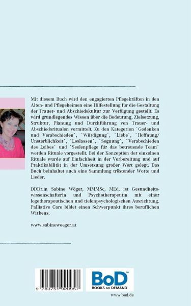 Mit diesem Buch wird den engagierten Pflegekräften in den Alten- und Pflegeheimen eine Hilfestellung für die Gestaltung der Trauer- und Abschiedskultur zur Verfügung gestellt. Es wird grundlegendes Wissen über die Bedeutung, Zielsetzung, Struktur, Planung und Durchführung von Trauer- und Abschiedsritualen vermittelt. Zu den Kategorien `Gedenken und Verabschieden`, `Würdigung`, `Liebe`, `Hoffnung/Unsterblichkeit`, `Loslassen`, `Segnung`, `Verabschieden des Leibes` und `Seelenpflege für das betreuende Team` werden Rituale vorgestellt. Bei der Konzeption der einzelnen Rituale wurde auf Einfachheit in der Vorbereitung und auf Praktikabilität in der Umsetzung großer Wert gelegt. Das Buch beinhaltet auch eine Sammlung tröstender Worte und Lieder.