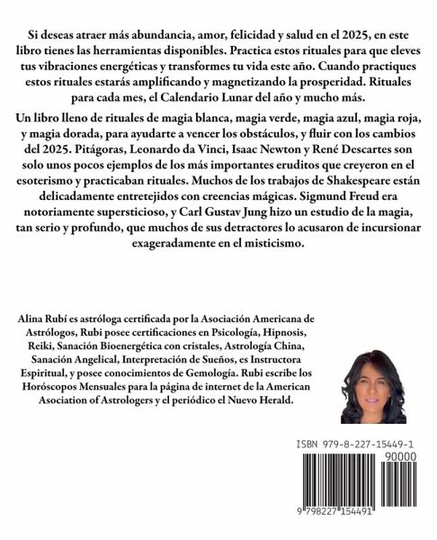 Si deseas atraer más abundancia, amor, felicidad y salud en el 2025, en este libro tienes las herramientas disponibles. Practica estos rituales para que eleves tus vibraciones energéticas y transformes tu vida este año. Cuando practiques estos rituales estarás amplificando y magnetizando la prosperidad. Rituales para cada mes, el Calendario Lunar del año y mucho más. Un libro lleno de rituales de magia blanca, magia verde, magia azul, magia roja, y magia dorada, para ayudarte a vencer los obstáculos, y fluir con los cambios del 2025. Pitágoras, Leonardo da Vinci, Isaac Newton y René Descartes son solo unos pocos ejemplos de los más importantes eruditos que creyeron en el esoterismo y practicaban rituales. Muchos de los trabajos de Shakespeare están delicadamente entretejidos con creencias mágicas. Sigmund Freud era notoriamente supersticioso, y Carl Gustav Jung hizo un estudio de la magia, tan serio y profundo, que muchos de sus detractores lo acusaron de incursionar exageradamente en el misticismo.