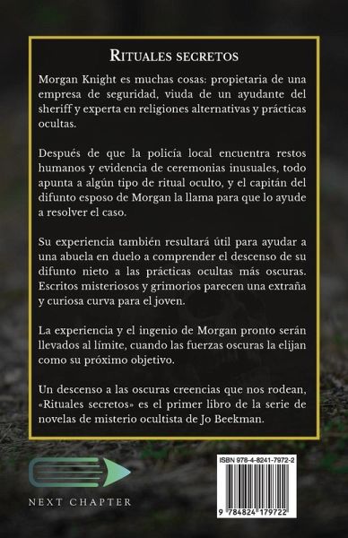 Morgan Knight es muchas cosas: propietaria de una empresa de seguridad, viuda de un ayudante del sheriff y experta en religiones alternativas y prácticas ocultas. Después de que la policía local encuentra restos humanos y evidencia de ceremonias inusuales, todo apunta a algún tipo de ritual oculto, y el capitán del difunto esposo de Morgan la llama para que lo ayude a resolver el caso. Su experiencia también resultará útil para ayudar a una abuela en duelo a comprender el descenso de su difunto nieto a las prácticas ocultas más oscuras. Escritos misteriosos y grimorios parecen una extraña y curiosa curva para el joven. La experiencia y el ingenio de Morgan pronto serán llevados al límite, cuando las fuerzas oscuras la elijan como su próximo objetivo. Un descenso a las oscuras creencias que nos rodean, Rituales secretos es el primer libro de la serie de novelas de misterio ocultista de Jo Beekman.