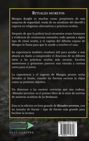 Morgan Knight es muchas cosas: propietaria de una empresa de seguridad, viuda de un ayudante del sheriff y experta en religiones alternativas y prácticas ocultas. Después de que la policía local encuentra restos humanos y evidencia de ceremonias inusuales, todo apunta a algún tipo de ritual oculto, y el capitán del difunto esposo de Morgan la llama para que lo ayude a resolver el caso. Su experiencia también resultará útil para ayudar a una abuela en duelo a comprender el descenso de su difunto nieto a las prácticas ocultas más oscuras. Escritos misteriosos y grimorios parecen una extraña y curiosa curva para el joven. La experiencia y el ingenio de Morgan pronto serán llevados al límite, cuando las fuerzas oscuras la elijan como su próximo objetivo. Un descenso a las oscuras creencias que nos rodean, Rituales secretos es el primer libro de la serie de novelas de misterio ocultista de Jo Beekman. Esta es la edición en letra grande de Rituales secretos, con un tamaño de fuente / tipo de fuente más grande para facilitar la lectura