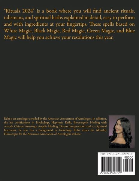 "Rituals 2024" is a book where you will find ancient rituals, talismans, and spiritual baths explained in detail, easy to perform and with ingredients at your fingertips. These spells based on White Magic, Black Magic, Red Magic, Green Magic, and Blue Magic will help you achieve your resolutions this year.