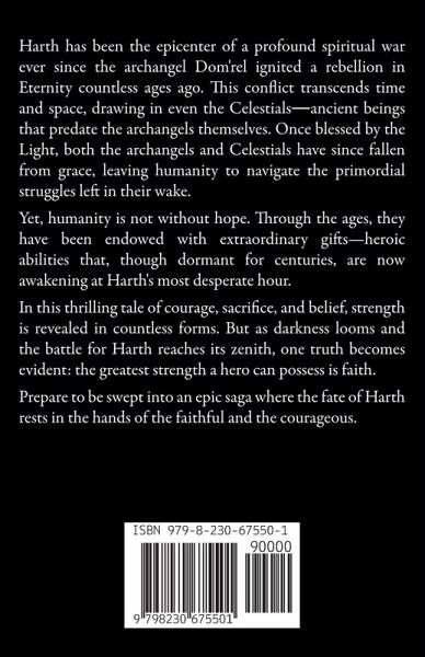 Harth has been the epicenter of a profound spiritual war ever since the archangel Dom'rel ignited a rebellion in Eternity countless ages ago. This conflict transcends time and space, drawing in even the Celestials-ancient beings that predate the archangels themselves. Once blessed by the Light, both the archangels and Celestials have since fallen from grace, leaving humanity to navigate the primordial struggles left in their wake. Yet, humanity is not without hope. Through the ages, they have been endowed with extraordinary gifts-heroic abilities that, though dormant for centuries, are now awakening at Harth's most desperate hour. In this thrilling tale of courage, sacrifice, and belief, strength is revealed in countless forms. But as darkness looms and the battle for Harth reaches its zenith, one truth becomes evident: the greatest strength a hero can possess is faith. Prepare to be swept into an epic saga where the fate of Harth rests in the hands of the faithful and the courageous.