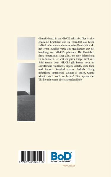 Gianni Moretti ist an ME/CFS erkrankt. Dies ist eine grausame Krankheit und sie verändert das Leben radikal. Aber niemand nimmt seine Krankheit wirklich ernst. Er wird alleine gelassen, und er findet zunächst keinerlei Hilfe. Leider ist in vielen Ländern der Erde, auch in Deutschland, diese Erkrankung unbekannt, und die Ärzte sind ratlos Glücklicherweise wurde zufällig ein Medikament zur Behandlung von ME/CFS gefunden. Die Herstellerfirma unternimmt aber nun alles, um eine Behandlung von Gianni Moretti zu verhindern. Sie will ihr gutes Image nicht aufs Spiel setzen, denn ME/CFS gilt in Deutschland immer noch als "umstrittene Krankheit". Tapara Moretti, seine Frau, und Andreas Steinfeld erleben deshalb ständig gefährliche Situationen. Immer wieder kommen sie in Gefahr. Gelingt es ihnen Gianni Moretti doch noch zu helfen? Ein spannender Thriller mit einem überraschenden Ende.
