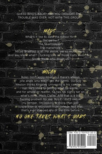 GUESS WHO'S BACK? AND YOU THOUGHT THE TROUBLE WAS OVER. NOT WITH THIS GROUP. Mads What's it like to date the school flirt? The partier? The heartbreaker? The manwhore? Micah Bradford is all the above, yet so much more. And you know what? I f*cking love all those traits about him. Screw those who doubt us. Micah Rules don't apply to us, but there's always one A-hole who didn't get the memo. Sterling Weston thinks Kingsley University is his campus to run. He's used to getting what he wants, and for whatever reason, he has his sights set on what's mine. Mads Clarke. And that is a big f*cking problem for me. But if I don't rein in my temper, I'm looking at more than just suspension or expulsion from college. Not that that's ever stopped any of the Elite before. No one takes what's ours. Trigger warnings: sexual assault, drugs, drinking, swearing.