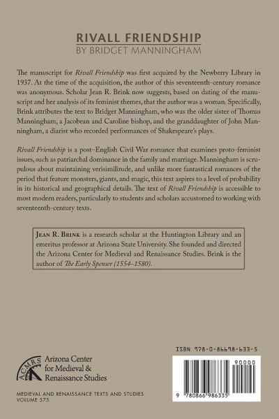 The manuscript for Rivall Friendship was first acquired by the Newberry Library in 1937. At the time of the acquisition, the author of this seventeenth-century romance was anonymous. Scholar Jean R. Brink now suggests, based on dating of the manuscript and her analysis of its feminist themes, that the author was a woman. Specifically, Brink attributes the text to Bridget Manningham, who was the older sister of Thomas Manningham, a Jacobean and Caroline bishop, and the granddaughter of John Manningham, a diarist who recorded performances of Shakespeare's plays. Rivall Friendship is a post-English Civil War romance that examines proto-feminist issues, such as patriarchal dominance in the family and marriage. Manningham is scrupulous about maintaining verisimilitude, and unlike more fantastical romances of the period that feature monsters, giants, and magic, this text aspires to a level of probability in its historical and geographical details. The text of Rivall Friendship is accessible to most modern readers, particularly to students and scholars accustomed to working with seventeenth-century texts.