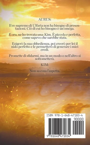 Aurus: Il re supremo di Ulfaria non ha bisogno di presentazioni. Ciò di cui ho bisogno è un'omega. E ora, ne ho trovata una: Kim. È piccola e perfetta, come sapevo che sarebbe stata. Esigerò la sua obbedienza, poi creerò per lei il nido perfetto e le permetterò di generare i miei eredi. Promette di sfidarmi, ma in un modo o nell'altro si sottometterà. Kim: Non sa cosa l'aspetta.
