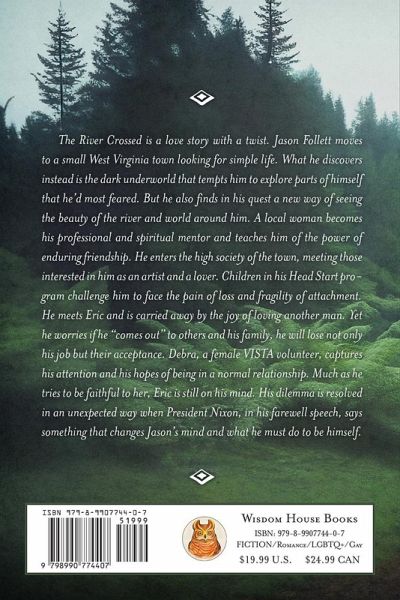 The River Crossed is a love story with a twist. Jason Follett moves to a small West Virginia town looking for simple life. What he discovers instead is the dark underworld that tempts him to explore parts of himself that he'd most feared. But he also finds in his quest a new way of seeing the beauty of the river and world around him. A local woman becomes his professional and spiritual mentor and teaches him of the power of enduring friendship. He enters the high society of the town, meeting those interested in him as an artist and a lover. Children in his Head Start program challenge him to face the pain of loss and fragility of attachment. He meets Eric and is carried away by the joy of loving another man. Yet he worries if he 'comes out' to others and his family, he will lose not only his job but their acceptance. Debra, a female VISTA volunteer, captures his attention and his hopes of being in a normal relationship. Much as he tries to be faithful to her, Eric is still on his mind. His dilemma is resolved in an unexpected way when President Nixon, in his farewell speech, says something that changes Jason's mind and what he must do to be himself.