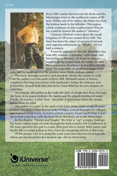 River Hill country lies between the Rock and the Mississippi rivers in the northwest corner of Illinois. Within one of its valleys, the fields rise from the bottom lands to the hillsides. This region, which continues on into southwestern Wisconsin, could be termed the author's "America." Clarence Mitchell writes about the small kingdom of 130 acres named River Hill. The farm has been the object of sustained interest and ongoing enthusiasm in "Mitch's" life for half a century. From his rampart on the hill, the author has seen fifty seasons of planting, cultivating, and harvesting on the land. He looks in wonderment as spring surges from the earth. He feels the somnolence of summer as it settles over the land. The pageantry of autumn is magic in his eyes, and he looks out over the pristine snow fields of deep winter. The story, through narrative and anecdote, invites the reader to walk with the author over the earth of River Hill. Mitchell's sense of history, coupled to his long association with landmarks, brings the intimacy and personality of each field into clear focus. Each field has its own chapter, its own story. Accompany the author as he walks the mile of stream that flows through the farm; as he pauses besides the rapids and the placid stretches of water. Finally, he reaches "Land's End," the point of departure where the stream passes from his land. The author is caught in the spell of the river. It has come a long distance to reach this place: it has flowed under bridges, passed through two villages, and coursed along lonely stretches of back country. From Land's End, it travels toward a juncture with the Rock River that flows on to the Mississippi. In the chapter, "Horses and People," the rider is "up" a trappy, bold-going horse, riding loops of roads through the back country. He is exuberant as the mare quickens her gait to a rack, then goes into a closely held canter, and finally lifts to a high gallop as they enter the remaining stretch of dirt road. Of the people who live along the road, some have become local legends, others are anachronisms in a modern age. All are interesting.