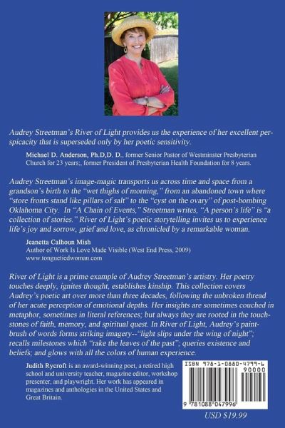 Praise for Audrey Streetman's River of Light Audrey Streetman's River of Light provides us the experience of her excellent perspicacity that is superseded only by her poetic sensitivity. Michael D. Anderson, Ph.D,D. D.Former Senior Pastor of Westminster Presbyterian Church for 23 yearsFormer President of Presbyterian Health Foundation for 8 years Audrey Streetman's image-magic transports us across time and space from a grandson's birth to the "wet thighs of morning," from an abandoned town where "store fronts stand like pillars of salt" to the "cyst on the ovary" of post-bombing Oklahoma City. In "A Chain of Events," Streetman writes, "A person's life" is "a collection of stories." River of Light's poetic storytelling invites us to experience life's joy and sorrow, grief and love, as chronicled by a remarkable woman. Jeanetta Calhoun MishAuthor of Work Is Love Made Visible (West End Press, 2009)www.tonguetiedwoman.com River of Light is a prime example of Audrey Streetman's artistry. Her poetry touches deeply, ignites thought, establishes kinship. This collection covers Audrey's poetic art over more than three decades, following the unbroken thread of her acute perception of emotional depths. Her insights are sometimes couched in metaphor, sometimes in literal references; but always they are rooted in the touchstones of faith, memory, and spiritual quest. In River of Light, Audrey's paintbrush of words forms striking imagery--"light slips under the wing of night"; recalls milestones which "rake the leaves of the past"; queries existence and beliefs; and glows with all the colors of human experience. Judith Rycroft is an award-winning poet, a retired high school and university teacher, magazine editor, workshop presenter, and playwright.Her work has appeared in magazines and anthologies in the United States and Great Britain.