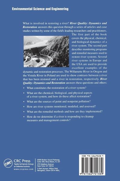 What is involved in restoring a river? River Quality: Dynamics and Restoration answers this question through a series of articles and case studies written by some of the field's leading researchers and practitioners. The first part of the book covers the physical, chemical, and biological dynamics of a river system. The second part describes monitoring programs and remedial measures used to restore river systems. The Willamette River in Oregon and the Vistula River in Poland are used to provide excellent examples of the dynamic and restoration processes.