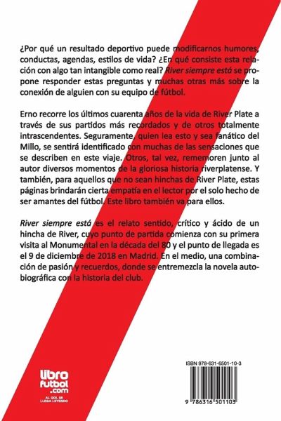 ¿Por qué un resultado deportivo puede modificarnos humores, conductas, agendas, estilos de vida? ¿En qué consiste esta relación con algo tan intangible como real? River siempre está se propone responder estas preguntas y muchas otras más sobre la conexión de alguien con su equipo de fútbol. Erno recorre los últimos cuarenta años de la vida de River Plate a través de sus partidos más recordados y de otros totalmente intrascendentes. Seguramente, quien lea esto y sea fanático del Millo, se sentirá identificado con muchas de las sensaciones que se describen en este viaje. Otros, tal vez, rememoren junto al autor diversos momentos de la gloriosa historia riverplatense. Y también, para aquellos que no sean hinchas de River Plate, estas páginas brindarán cierta empatía en el lector por el solo hecho de ser amantes del fútbol. Este libro también va para ellos. River siempre está es el relato sentido, crítico y ácido de un hincha de River, cuyo punto de partida comienza con su primera visita al Monumental en la década del 80 y el punto de llegada es el 9 de diciembre de 2018 en Madrid. En el medio, una combinación de pasión y recuerdos, donde se entremezcla la novela autobiográfica con la historia del club.