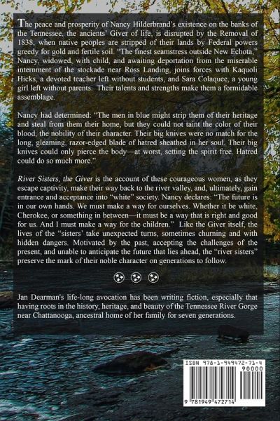 The peace and prosperity of Nancy Hilderbrand’s existence on the banks of the Tennessee, the ancients’ Giver of life, is disrupted by the Removal of 1838, when native peoples are stripped of their lands by Federal powers greedy for gold and fertile soil. "The finest seamstress outside New Echota," Nancy, widowed, with child, and awaiting deportation from the miserable internment of the stockade near Ross Landing, joins forces with Kaquoli Hicks, a devoted teacher left without students, and Sara Colaquee, a young girl left without parents. Their talents and strengths make them a formidable assemblage. Nancy had determined: "The men in blue might strip them of their heritage and steal from them their home, but they could not taint the color of their blood, the nobility of their character. Their big knives were no match for the long, gleaming, razor-edged blade of hatred sheathed in her soul. Their big knives could only pierce the body—at worst, setting the spirit free. Hatred could do so much more." River Sisters, the Giver is the account of these courageous women, as they escape captivity, make their way back to the river valley, and, ultimately, gain entrance and acceptance into "white" society. Nancy declares: "The future is in our own hands. We must make a way for ourselves. Whether it be white, Cherokee, or something in between—it must be a way that is right and good for us. And I must make a way for the children." Like the Giver itself, the lives of the "sisters’ take unexpected turns, sometimes churning and with hidden dangers. Motivated by the past, accepting the challenges of the present, and unable to anticipate the future that lies ahead, the "river sisters" preserve the mark of their noble character on generations to follow.