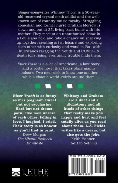 Singer-songwriter Whitney Thorn is a 50-year-old recovered crystal meth addict and the well-known son of country music royalty. Struggling comedian and former nurse Graham Morrow is down and out at 35, living back home with his mother. They meet at an unauthorized, socially distanced show in a Louisiana field and take a chance on shacking up together. At first, their bubble is untouched by tragedy. They create art at leisure and explore each other with curiosity and wonder. Friends from Whitney's checkered past check in with him regularly, worried he could relapse. Graham watches his mother, aunt, and cousin Sage struggle in isolation while he escapes into Whitney's world. But with hurricanes ravaging other parts of the South and death tolls rising due to COVID-19, eventually trouble finds them. An unexpected surgery poses a serious risk. The presence of pain meds strains sobriety. Hospitalizations end in sudden losses. Homes are lost and must be rebuilt. River Trash is a slice of Americana, a love story, and a bottle novel that takes place mainly indoors. Two men seek to know one another while a chaotic world swirls around them.