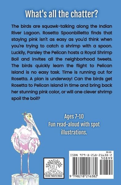 River Tweets: The Royal Shrimp Boil is a fictional adventure with a whimsical sense of humor. The characters are birds who live among the mangrove trees on the Indian River Lagoon. Character traits include friendship and combining talents in order to accomplish a goal. Spot illustrations and photographs make for a fun read-aloud for young children. Readers ages seven to ten will build confidence and skills. The story is scattered with rhymes, poetry, puns, similes, alliteration, vocabulary, and word play. A recipe from the story is included as a follow-up hands-on activity. The mix of fantasy and reality is a great way to inspire children to learn more about wildlife and the natural environment. What's all the chatter? Staying pink isn't as easy as you think when you're Rosetta Spoonbilletta trying to catch a shrimp with a spoon. Rosetta is a local artist who lives among the mangrove trees in the land of "Old Florida." Her paintbrush suddenly comes to a stop when her reflection reveals her feathers have lost the ink that keep them pink. Rosetta can't catch a break. She can't even catch a shrimp! Luckily, Parsley the Pelican, the town chef, tweets her an invite to his Royal Shrimp Boil. He promises a gathering of friends and a bellyful of shrimp to turn her rosy pink again. The invite is tweeted along to Charminga the Anhinga, Chuckle the Laughing Gull, and other local birds. Each bird brings a special talent and ingredient for the pot. While Parsley is busy tricking shrimp into coming to his early-bird special, the birds realize the food is too heavy to fly across the river to Pelican Island. Rosetta comes up with a plan, but it takes everyone's help to make it happen. One clever shrimp is out to spoil the boil and rescue his friends. The race is on to turn Rosetta pink so she can finish her painting and return to the stunning Rosetta Spoonbilletta that everyone adores.