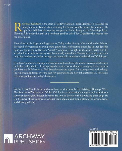 R iverboat Gamblers is the story of Teddy Halloran. Born destitute, he escapes the family's farm in Kansas after watching his father brutally murder his mother. He is put in a hellish orphanage but escapes and finds his way to the Mississippi River. There he falls under the spell of a riverboat gambler called Tex Chandler who teaches him the art of poker. Always looking for bigger and bigger games, Teddy makes his way to New York and to Lehman Brothers before starting his own private equity firm. He becomes embroiled in a tender offer fight to acquire the Gulfstream Aircraft Company. This fight to the death battle with his archrival for the ultimate luxury asset is eventually settled in a Manhattan criminal court, but only after leading the reader through the potentially murderous underbelly of Wall Street. Riverboat Gamblers is the saga of a man who embraced and ultimately overcame risk because he had no other choice. It brings together a rich cast of characters ranging from riverboat gamblers and faith healers to Wall Street lawyers and rogues. It is a unique look at the changing American landscape over the past few generations and how it has affected us. Yesterday's riverboat gamblers are today's financiers.