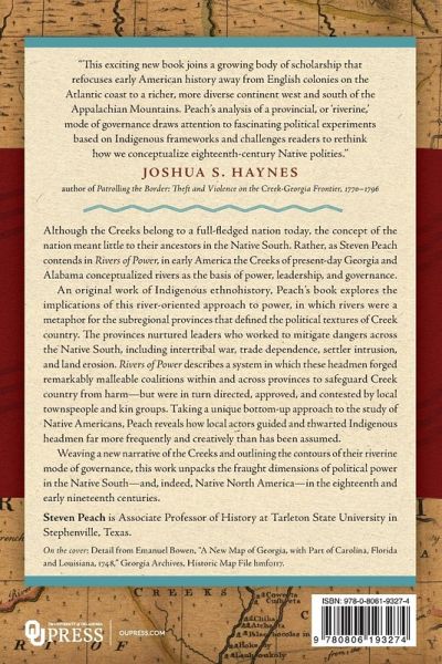 Although the Creeks belong to a full-fledged nation today, the concept of the "nation" meant little to their ancestors in the Native South. Rather, as Steven Peach contends in Rivers of Power, in early America the Creeks of present-day Georgia and Alabama conceptualized rivers as the basis of power, leadership, and governance. An original work of Indigenous ethnohistory, Peach's book explores the implications of this riverine approach to power, where rivers were a metaphor for the sub-regional provinces that defined the political textures of Creek country. The provinces nurtured leaders who worked to mitigate dangers across the Native South, including intertribal war, trade dependence, settler intrusion, and land erosion. Rivers of Power describes a system in which these headmen forged remarkably malleable coalitions within and across provinces to safeguard Creek country from harm-but were in turn directed, approved, and contested by local townspeople and kin groups. Taking a unique bottom-up approach to the study of Native Americans, Peach reveals how local actors guided and thwarted Indigenous headmen far more frequently and creatively than has been assumed. He also shows that although the Creeks traced descent through the maternal line, some became more comfortable with bilateral kinship, giving weight to both the paternal and maternal lineages. Fathers and sons thus played greater roles in Creek governance than the Indigenous scholarship has acknowledged. Weaving a new narrative of the Creeks and outlining the contours of their riverine mode of governance, this work unpacks the fraught dimensions of political power in the Native South-and, indeed, Native North America-in the eighteenth and early nineteenth centuries. By privileging Indigenous thought and intertribal history, it also advances the larger project of Native American history.