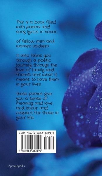 This is a book filled with poems and song lyrics in honor, of fellow men and women soldiers. It also takes you through a poetic journey through the love of family and friends and what it means to have them in your lives. these pomes give you a sense of meaning and love and honor and respect for those in your life.