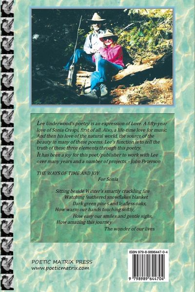 INTRODUCTION Nearly all of the poems included in Riversong are new. They are expressions of personal love, transcendental realization, and my deep involvement with nature and music. STREAM. . .RIVER. . .FLOW, that starts off the FOREVER SONGS Section, for example, is a journey from youth's first realization of the power of music, when as a nine-year-old boy, lying in bed, I held a plastic radio up to my ear, listening to "The Grand Ol' Opry," and heard for the first time the magical guitar of Chet Atkins. I had never heard anything remotely like what he was doing with his music. I was transported into the first heaven I had ever known. That musical experience awakened me to the realization that life itself is a stream, a river, an eternal flowng that forever surrounds us and infuses us and carries us through waves of music, which only sometimes do we become aware of. Life is a RIVERSONG filled with light, fire, and beauty. Life itself is that RIVERSONG. As my life streamed on, other adventures appeared to me in that music flow - such as running away from home in Big Spring west Texas as a 14-year-old boy, hitchhiking to Memphis, stealing a row boat, and sailing down the Mississippi River. That journey was the first of many adventures that river-streamed through my life, including learning how to drink beer as a college student, how to make love, and, later on, how to play guitar, which hearkened me back to the music of Chet Atkins. STREAM. . .RIVER. . .FLOW also includes a mini-biography of my journey as the lead guitarist with a "wild-haired singer" (which some readers will recognize as Tim Buckley.)