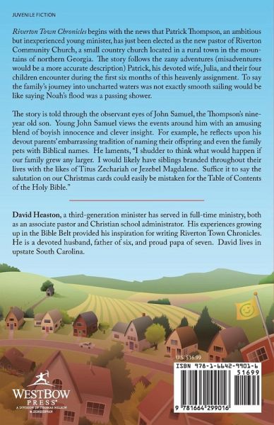 Riverton Town Chronicles begins with the news that Patrick Thompson, an ambitious but inexperienced young minister, has just been elected as the new pastor of Riverton Community Church, a small country church located in a rural town in the mountains of northern Georgia. The story follows the zany adventures (misadventures would be a more accurate description) Patrick, his devoted wife, Julia, and their four children encounter during the first six months of this heavenly assignment. To say the family's journey into uncharted waters was not exactly smooth sailing would be like saying Noah's flood was a passing shower. The story is told through the observant eyes of John Samuel, the Thompson's nine-year old son. Young John Samuel views the events around him with an amusing blend of boyish innocence and clever insight. For example, he reflects upon his devout parents' embarrassing tradition of naming their offspring and even the family pets with Biblical names. He laments, "I shudder to think what would happen if our family grew any larger. I would likely have siblings branded throughout their lives with the likes of Titus Zechariah or Jezebel Magdalene. Suffice it to say the salutation on our Christmas cards could easily be mistaken for the Table of Contents of the Holy Bible."
