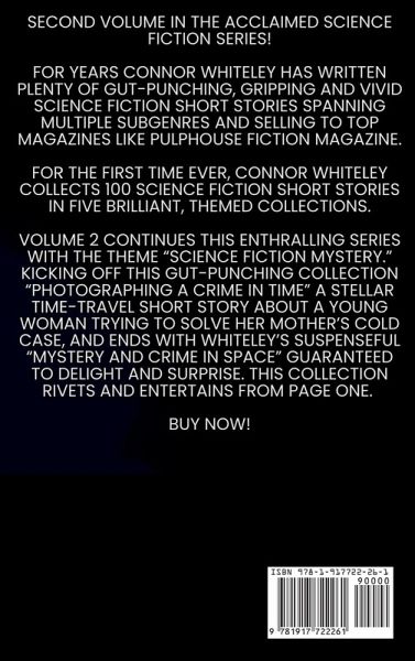 Second Volume in the acclaimed science fiction series! For years Connor Whiteley has written plenty of gut-punching, gripping and vivid science fiction short stories spanning multiple subgenres and selling to top magazines like Pulphouse Fiction Magazine. For the first time ever, Connor Whiteley collects 100 science fiction short stories in five brilliant, themed collections. Volume 2 continues this enthralling series with the theme "Science Fiction Mystery." Kicking off this gut-punching collection "Photographing a Crime in Time" a stellar time-travel short story about a young woman trying to solve her mother's cold case, and ends with Whiteley's suspenseful "Mystery and Crime In Space" guaranteed to delight and surprise. This collection rivets and entertains from page one. BUY NOW!
