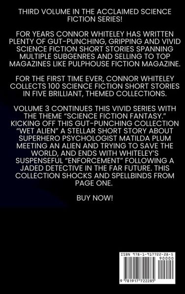Third Volume in the acclaimed science fiction series! For years Connor Whiteley has written plenty of gut-punching, gripping and vivid science fiction short stories spanning multiple subgenres and selling to top magazines like Pulphouse Fiction Magazine. For the first time ever, Connor Whiteley collects 100 science fiction short stories in five brilliant, themed collections. Volume 3 continues this vivid series with the theme "Science Fiction Fantasy." Kicking off this gut-punching collection "Wet Alien" a stellar short story about superhero psychologist Matilda Plum meeting an alien and trying to save the world, and ends with Whiteley's suspenseful "Enforcement" following a jaded detective in the far future. This collection shocks and spellbinds from page one. BUY NOW!
