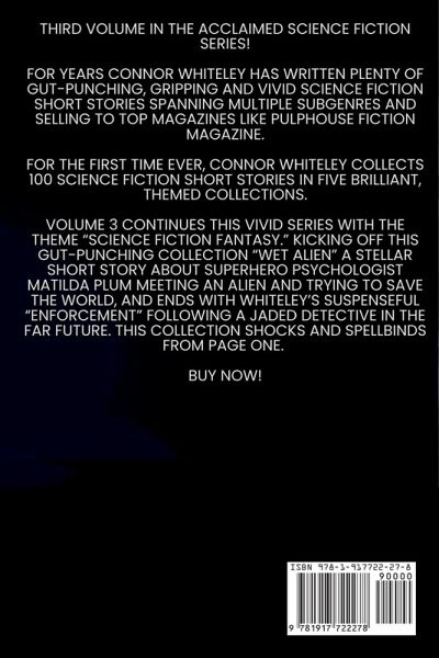 Third Volume in the acclaimed science fiction series! For years Connor Whiteley has written plenty of gut-punching, gripping and vivid science fiction short stories spanning multiple subgenres and selling to top magazines like Pulphouse Fiction Magazine. For the first time ever, Connor Whiteley collects 100 science fiction short stories in five brilliant, themed collections. Volume 3 continues this vivid series with the theme "Science Fiction Fantasy." Kicking off this gut-punching collection "Wet Alien" a stellar short story about superhero psychologist Matilda Plum meeting an alien and trying to save the world, and ends with Whiteley's suspenseful "Enforcement" following a jaded detective in the far future. This collection shocks and spellbinds from page one. BUY NOW!