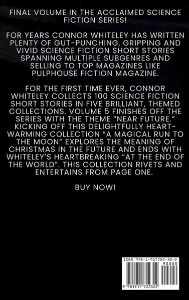 Final Volume in the acclaimed science fiction series! For years Connor Whiteley has written plenty of gut-punching, gripping and vivid science fiction short stories spanning multiple subgenres and selling to top magazines like Pulphouse Fiction Magazine. For the first time ever, Connor Whiteley collects 100 science fiction short stories in five brilliant, themed collections. Volume 5 finishes off the series with the theme "Near Future." Kicking off this delightfully heart-warming collection "A Magical Run To The Moon" explores the meaning of Christmas in the future and ends with Whiteley's heartbreaking "At The End of The World". This collection rivets and entertains from page one. BUY NOW!
