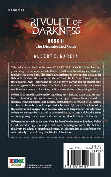 This is the second book in the series RIVULET OF DARKNESS. It has been two years living on a farm just outside Hanford, California. Something very dark and terrifying has come back. The images and nightmares have become a reality for Robert De Le Cruz, the younger brother of David De Le Cruz. After finding the truth behind David's experiences in the first story, David's brother Robert must now struggle with his own fears. Like David, Robert experiences his own strange manifestation, unaware of what any of it means and what is happening to him. Robert finds himself confronted by something very dark and unnerving. He must face the terrifying nightmares, becoming a struggle between his world and the darkness which surrounds him at night. Something evil is feeding off his anxiety and fears as he finds himself trapped inside his own nightmare. He is haunted by the memories and images, which becomes difficult to escape from. This only forces Robert to constantly be reminded by and overwhelming sadness and fear that never seems to go away. Robert must find a way to stop all of this before it's too late. Robert must now rely on his Aunt Vera, his father's older sister, to help him. Unlike David, Robert struggles to keep himself from becoming lost within the darkness filled with the echoes of disembodied voices. The disembodied voices of those who wait patiently to pass through the Rivulet of Darkness.