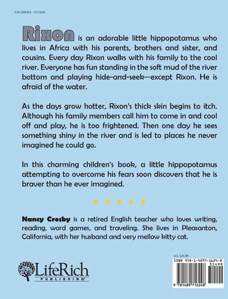 Rixon is an adorable little hippopotamus who lives in Africa with his parents, brothers and sister, and cousins. Every day Rixon walks with his family to the cool river. Everyone has fun standing in the soft mud of the river bottom and playing hide-and-seekexcept Rixon. He is afraid of the water. As the days grow hotter, Rixons thick skin begins to itch. Although his family members call him to come in and cool off and play, he is too frightened. Then one day he sees something shiny in the river and is led to places he never imagined he could go. In this charming childrens book, a little hippopotamus attempting to overcome his fears soon discovers that he is braver than he ever imagined.