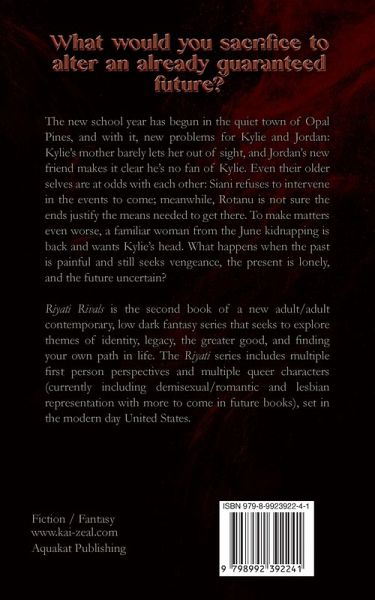 What happens when the past seeks vengeance, the present is lonely, and the future looks uncertain? While Kylie survived the kidnapping incident of June, it's left her life in shambles, constantly confined under her mother's supervision or locked in her bedroom. Worse, Kylie soon learns that while Asuza may be dead, his supporters are very much alive - including a certain familiar woman from the kidnapping who knows Kylie's at fault for Asuza's demise and wants nothing more than to repay the favor. All Kylie can do is trust Siani, even knowing Siani allowed her to be kidnapped in the first place and that Siani openly hides yet more secrets - dark secrets that could threaten Kylie's own existence. But if she can't count on her own future-self, who can Kylie trust? She'll have to decide who her allies are- and fast - if she wants to survive in this new life or else she won't make it to the end of the year. Riyati Rivals is the second book in a new adult/adult contemporary, low dark fantasy series that seeks to explore themes of identity, legacy, generational trauma, and finding your own path in life. The series is set in the modern day fictional Southern US town of Opal Pines and includes multiple first person perspectives with characters across a range of queer, neurodiverse, and socioeconomic statuses.